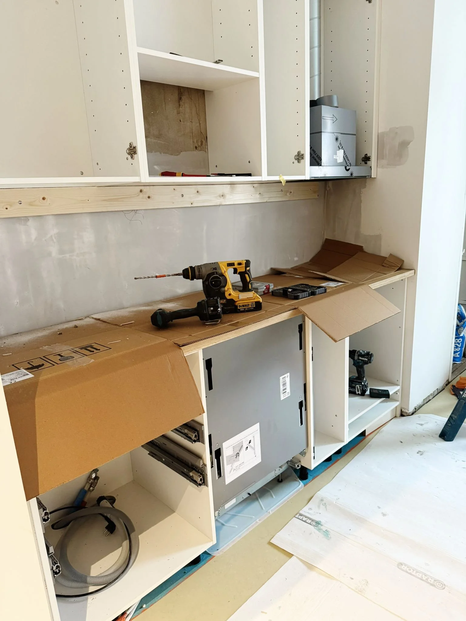 Old kitchen cabinets and whiteware were removed and renewed. New layout and lighting planning. Wallpaper with glass on backsplash. Photos before and after.