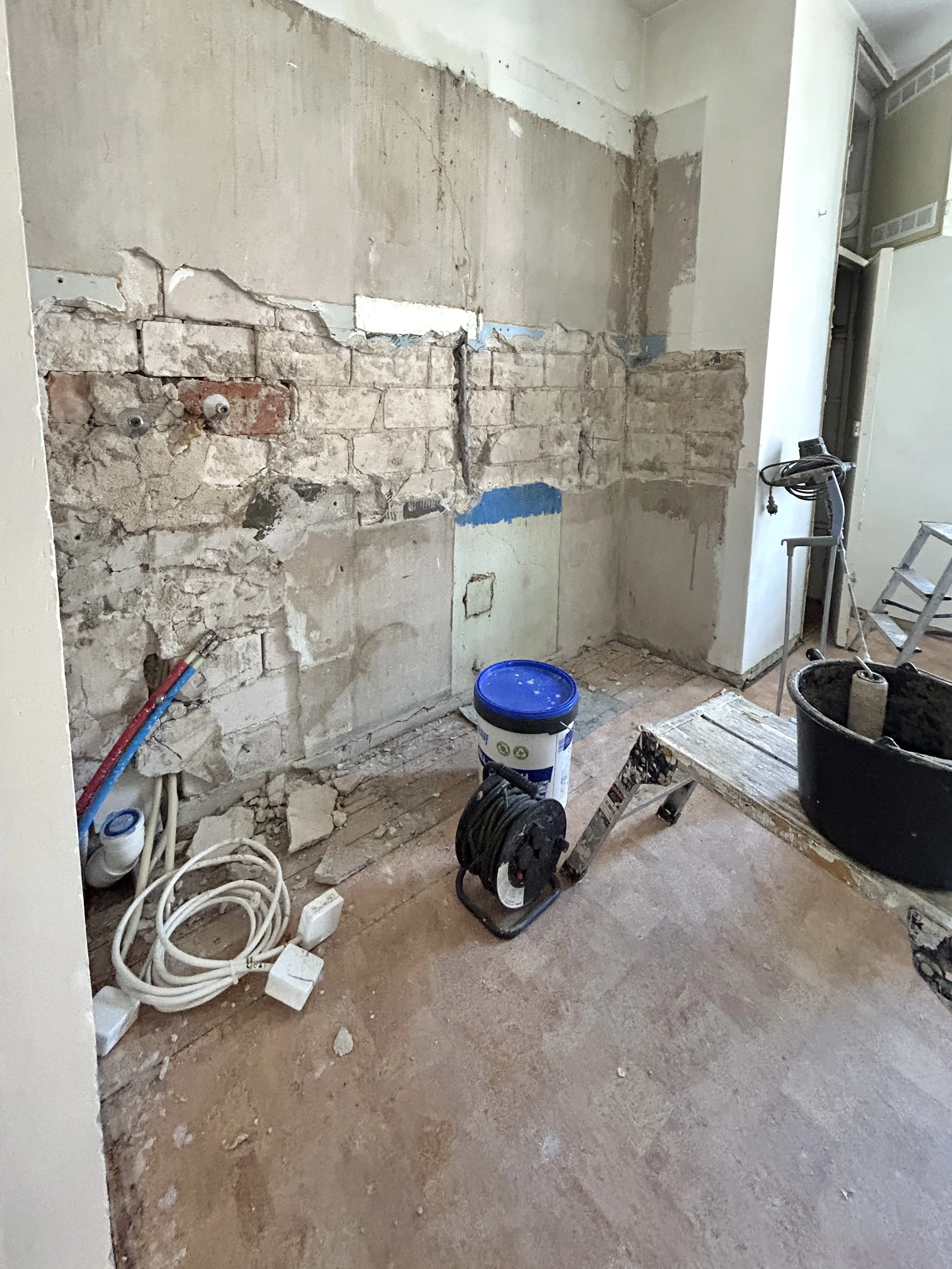Old kitchen was renewed, new parquet and colours. The furnitures were replaced by new/secondhand. Photos before, during renovation and after.